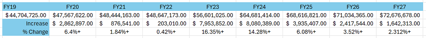 Looking back from FY19 through FY27, Methuen’s Chapter 70 aid tells a story of sharp swings rather than steady, reliable growth. Some years brought modest increases barely clearing inflation. Others delivered double-digit jumps.
