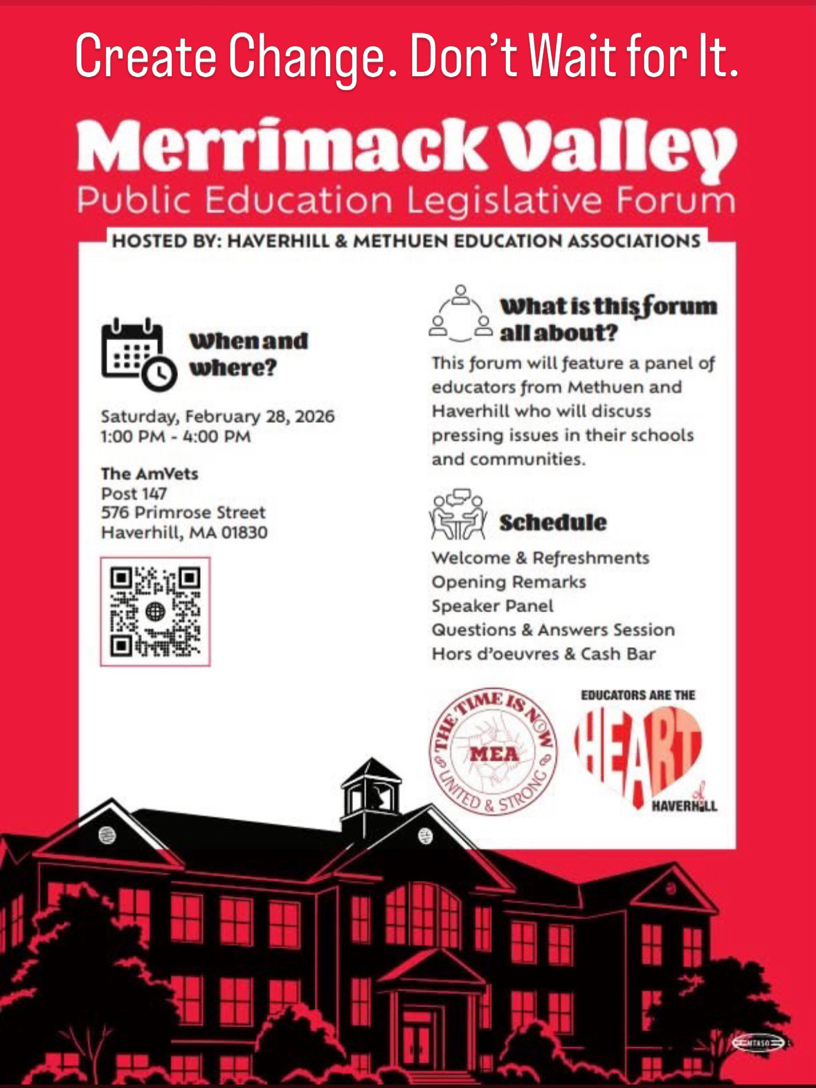 Hosted by the Haverhill and Methuen Education Associations, the forum brought together classroom teachers, specialists, and education advocates to discuss funding disparities, staffing shortages, student needs, and legislative priorities. The message of the day was clear from the moment attendees walked in wearing red in solidarity. Create change. Do not wait for it.