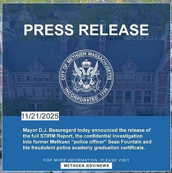 In March 2023, the City of Methuen received a detailed internal investigative report from STIRM Group regarding whether former firefighter, former City Council President, and intermittent police officer Sean Fountain had submitted a forged police academy training certificate to obtain and maintain employment with the Methuen Police Department.